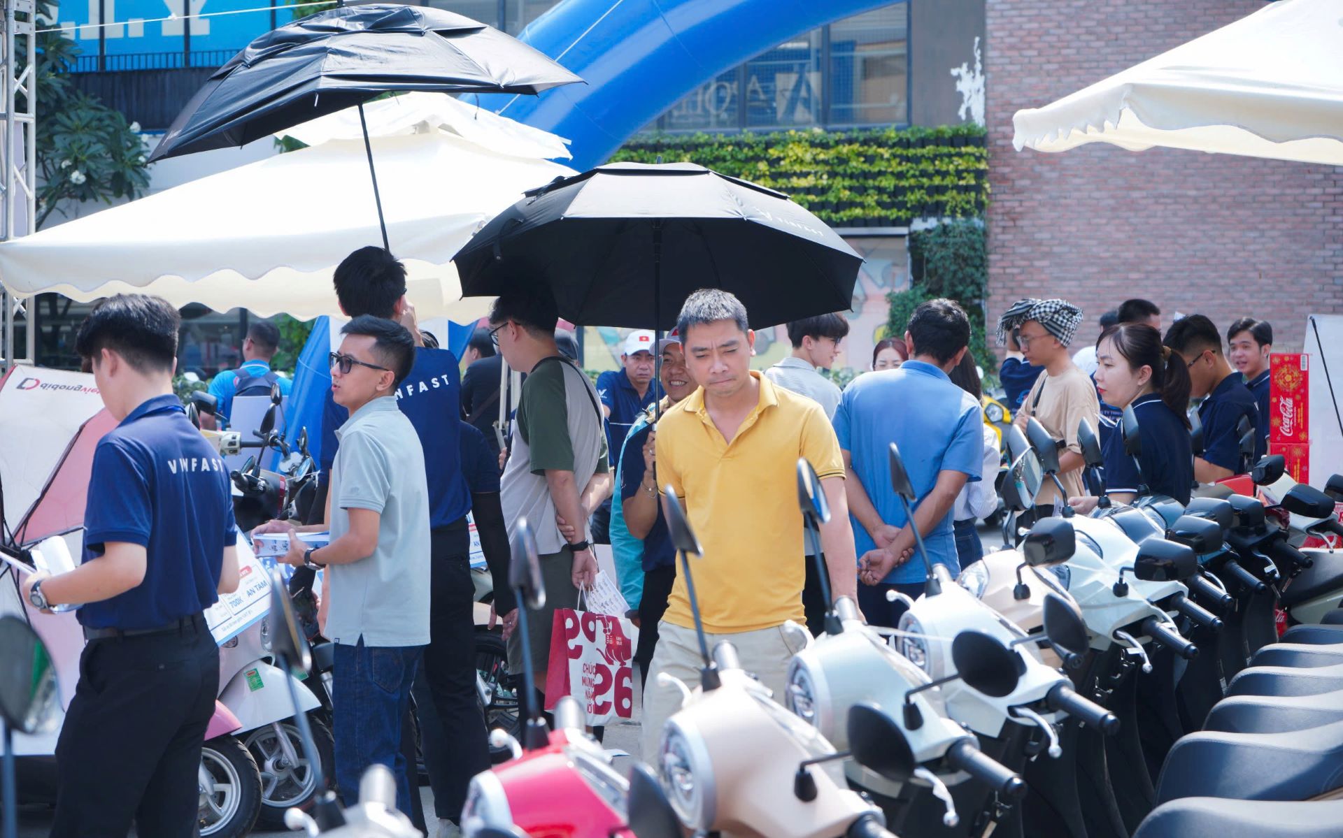 Từ 8h đến 20h, rất đông khách hàng đã xếp hàng để tự tay cầm lái xe máy điện VinFast